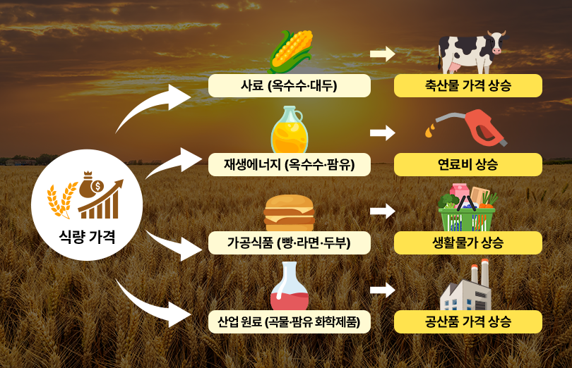 식량은 인류가 매일 소비하는 주식이자 경제 전반을 떠받치는 핵심 자원입니다. 축산업은 옥수수와 대두로 만든 사료에 의존하고, 바이오에탄올·바이오디젤 같은 재생에너지 연료는 옥수수와 팜유에서 나옵니다. 빵·라면·두부 같은 가공식품부터 화학제품 원료까지 모두 곡물에 기반합니다. 따라서 식량 가격 불안은 밥상 물가뿐 아니라 고기값, 연료비, 공산품 가격까지 연쇄적으로 끌어올립니다.