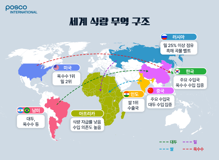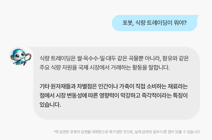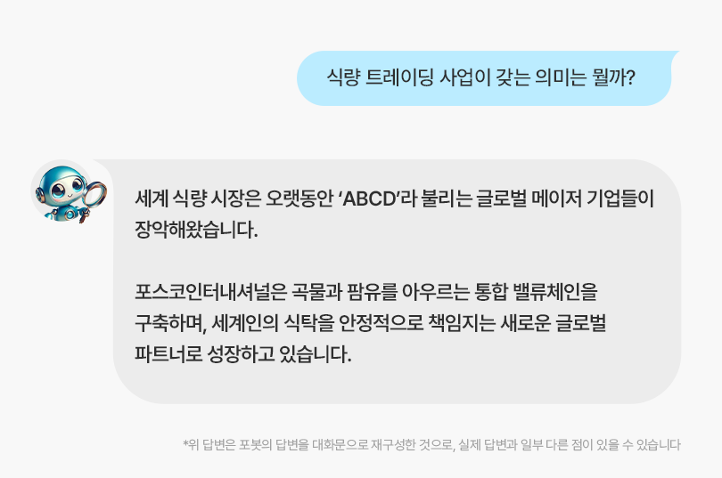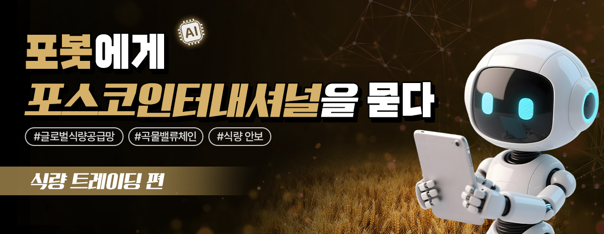 포스코인터내셔널은 반세기가 넘는 상사맨 특유의 도전정신을 바탕으로 글로벌 공룡기업들이 선점하고 있는 식량분야에서도 점차 성과를 확대해 나가고 있습니다. 이번 편에서는 포봇에게 식량 트레이딩의 중요성과 포스코인터내셔널의 전략을 물어봤습니다.