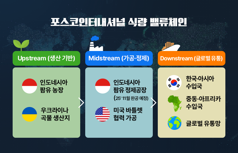 포스코인터내셔널은 이 거대 기업들에 맞서 ‘골리앗에 도전하는 다윗’과 같은 도전정신을 바탕으로 글로벌 시장에 도전하고 있습니다. 특히 곡물과 팜유를 아우르는 통합 밸류체인은 포스코인터내셔널의 새로운 성장 엔진이자 글로벌 경쟁력을 높이는 전략적 자산입니다. 나아가 국가 식량안보를 뒷받침하며 글로벌 식량시장 안정에도 기여할 수 있는 대한민국을 대표하는 식량기업으로 도약하는 것을 목표로 하고 있습니다.