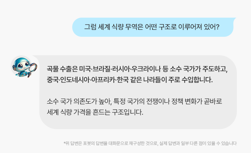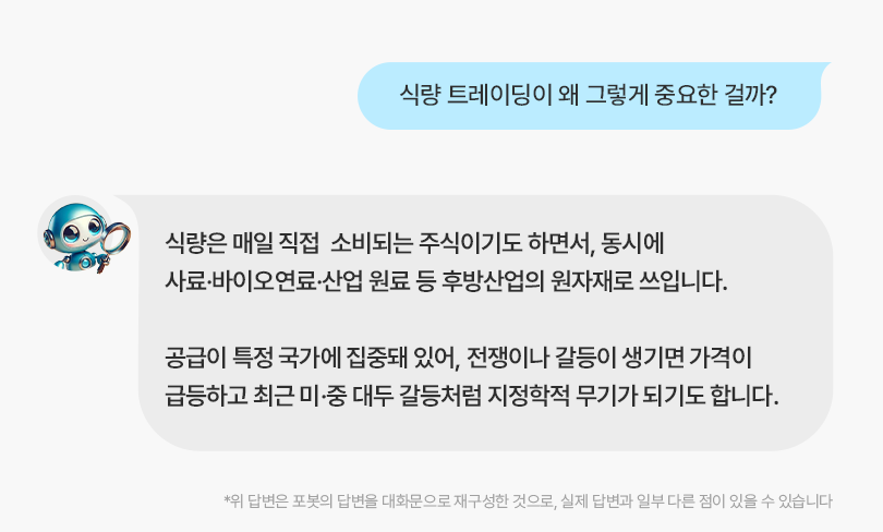 이처럼 식량은 언제든 지정학적 갈등 속에서 ‘경제적 무기’로 활용될 수 있습니다. 각국이 식량 트레이딩을 단순 시장 논리보다 국가 안보 차원에서 다루는 이유입니다.