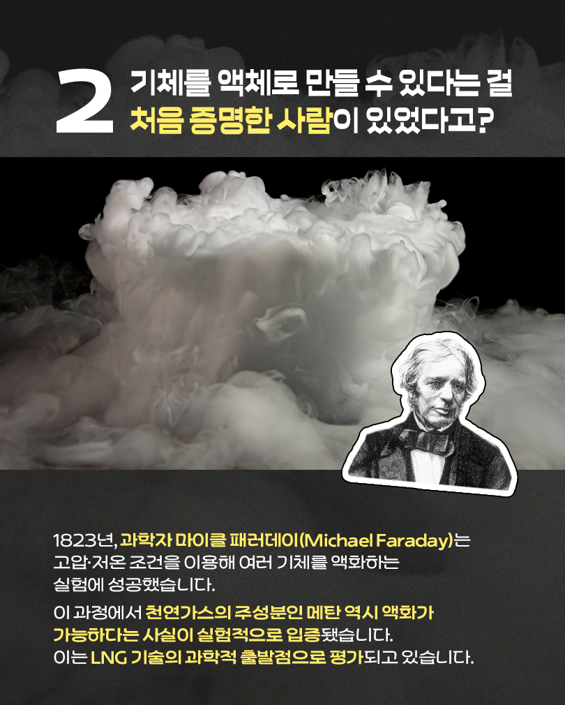 눈에 보이지 않고 형태를 유지할 수 없는 기체는 저장도, 장거리 운송도 불가능했기 때문이죠. 천연가스가 산업이 되기 위해서는, 이 물질을 관리 가능한 형태로 바꾸는 기술이 필요했습니다.