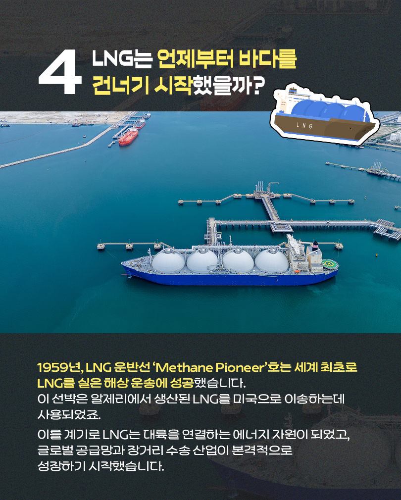 1959년 LNG 운반선이 바다를 건너는 데 성공하면서, 천연가스는 파이프라인이라는 물리적 한계를 넘어설 수 있게 됐습니다.