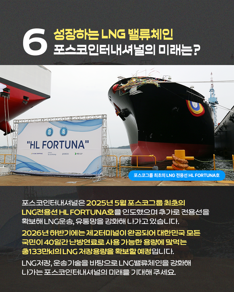 오늘날 LNG 산업은 저장과 운송을 넘어 밸류체인 전반으로 확장되고 있으며, 이 과정에서 포스코인터내셔널은 LNG 저장·운송 인프라를 기반으로 글로벌 공급망의 안정성을 강화하는 역할을 수행하고 있습니다.