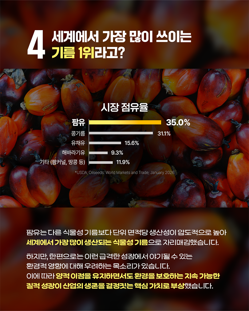 팜유는 단위 면적당 생산량이 대두유(콩기름) 등 다른 식물성 기름보다 높습니다.
